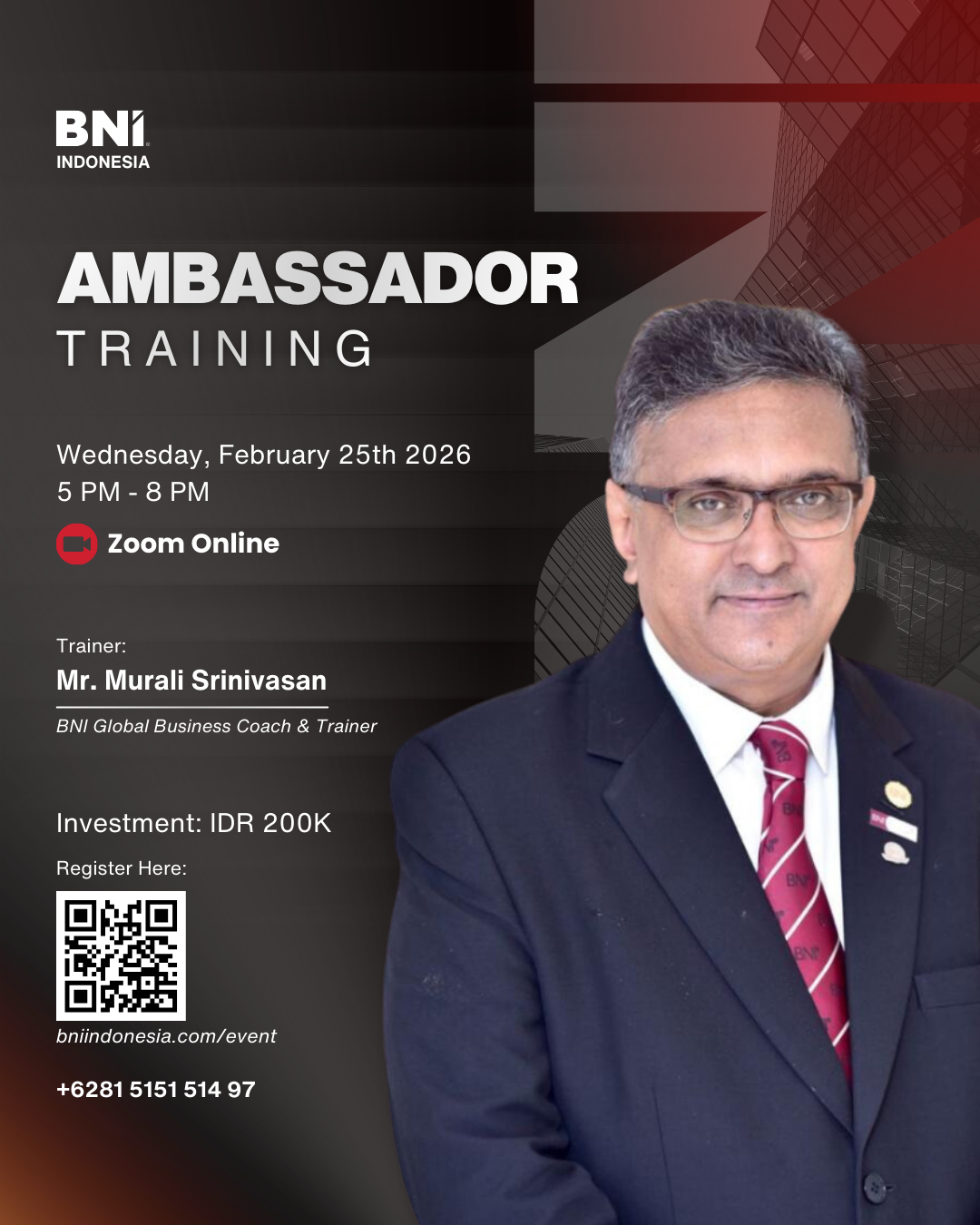 Ambassador Training dirancang untuk membekali peserta dengan pemahaman dan keterampilan sebagai representatif profesional dalam jaringan BNI. Sesi ini akan membahas peran strategis seorang Ambassador dalam membangun kredibilitas, komunikasi yang berdampak, serta hubungan bisnis yang berkelanjutan.