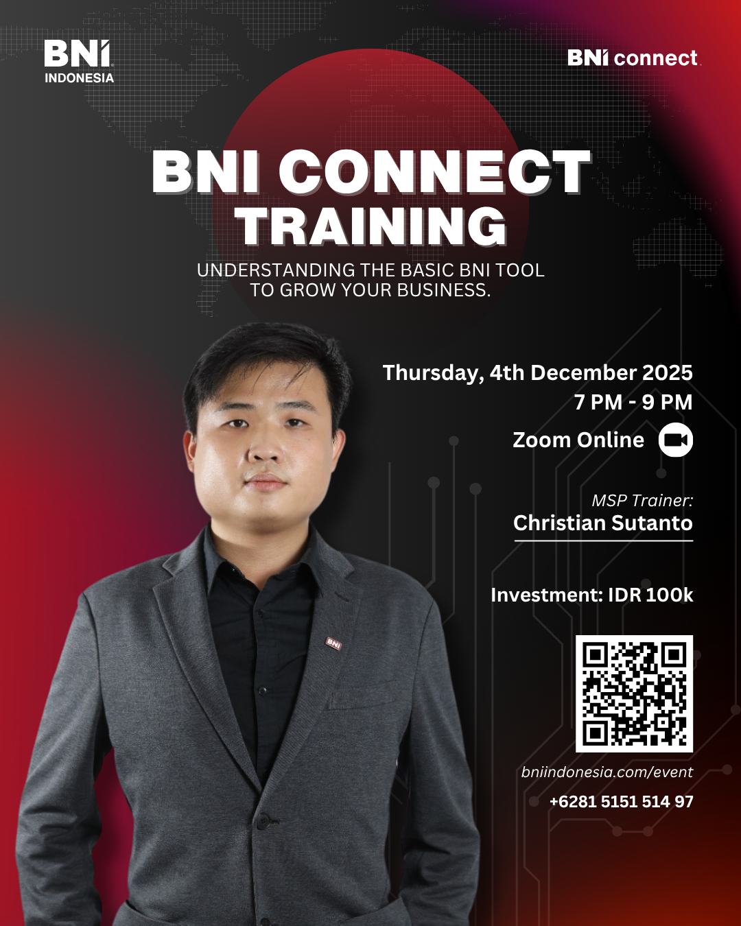 BNI Connect Training merupakan pelatihan rutin yang dirancang untuk membantu member memanfaatkan platform digital BNI Connect secara optimal. Melalui sesi ini, peserta akan mempelajari cara mengelola profil profesional, membangun visibilitas bisnis, serta memanfaatkan fitur-fitur utama untuk memperluas jaringan dan peluang referal.
