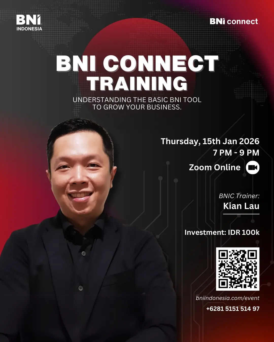 BNI Connect Training dirancang untuk membantu member memahami cara kerja BNI Connect secara benar sehingga aktivitas bisnis dan networking mereka bisa tercatat lebih rapi, terukur, dan efektif. Banyak member yang sebenarnya sudah aktif di chapter, namun belum memaksimalkan platform ini sebagai alat untuk membangun visibilitas, kredibilitas, dan peluang referral. Melalui training ini, peserta akan mendapatkan pemahaman yang lebih jelas tentang bagaimana BNI Connect mendukung pertumbuhan bisnis, mempermudah pengelolaan data, serta memperkuat kontribusi mereka di dalam chapter.