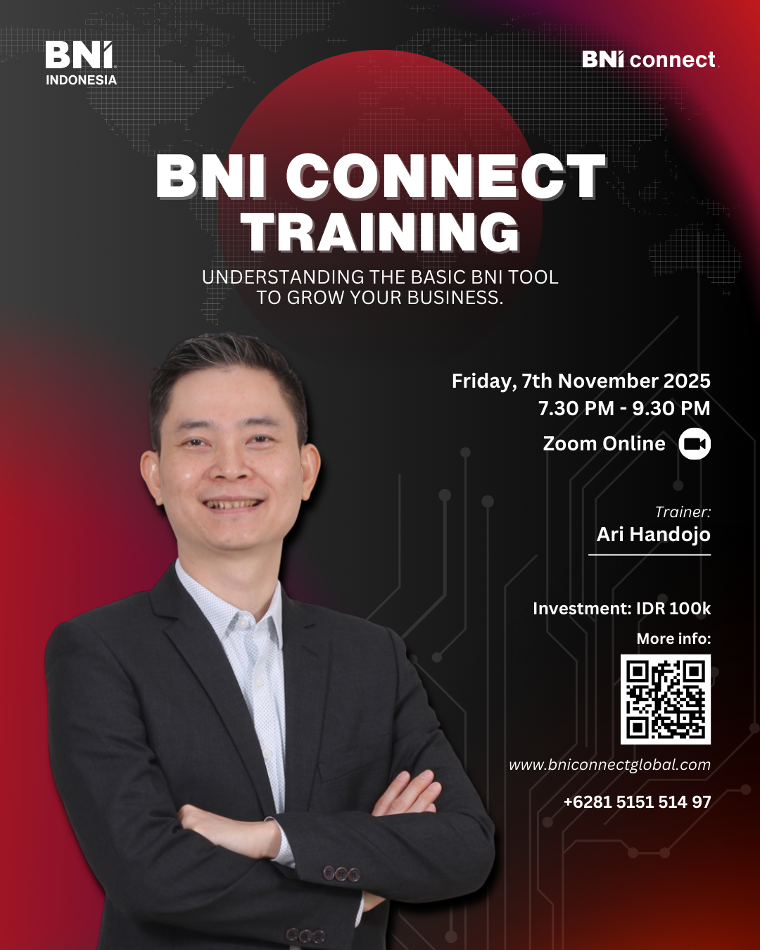 Dalam sesi ini, Ari Handojo akan membimbing peserta memahami dasar-dasar penggunaan BNI Connect sebagai alat penting bagi setiap member BNI dalam membangun relasi bisnis yang produktif.