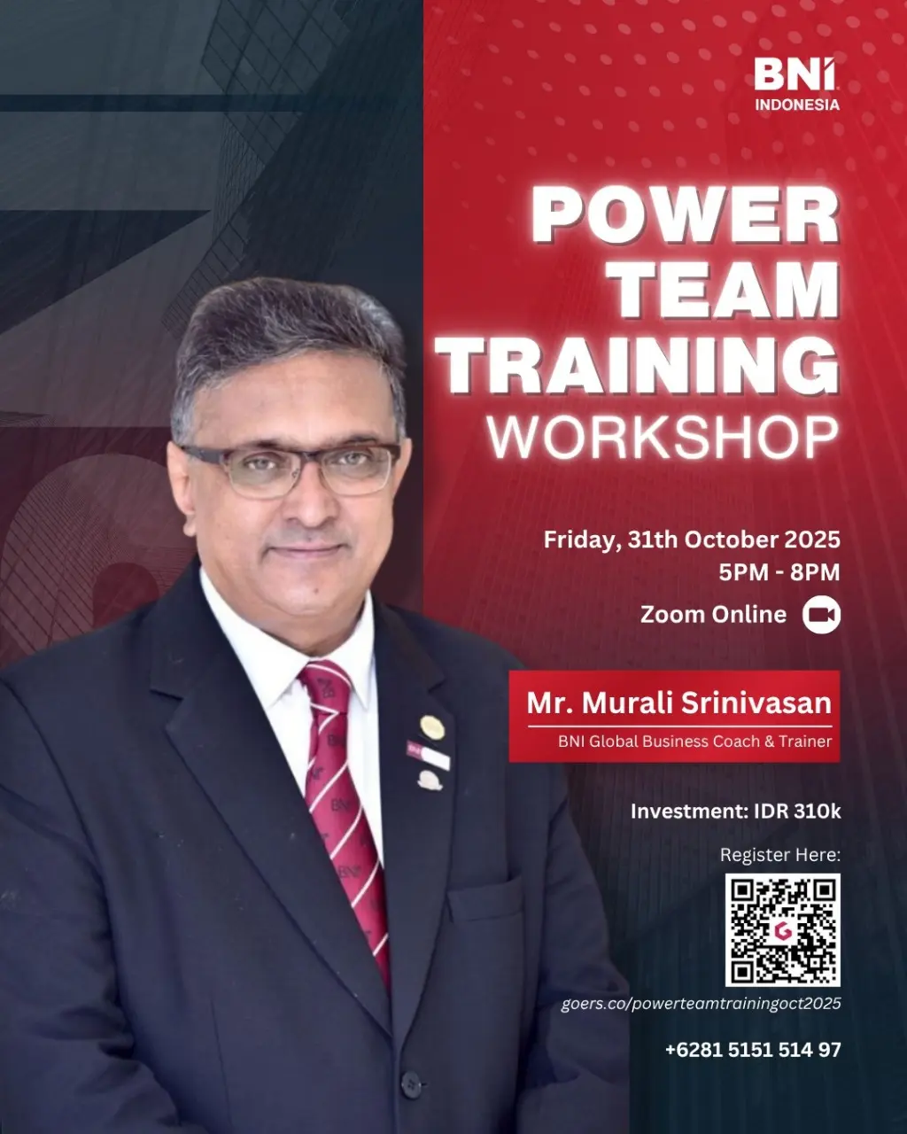 On October 31, 2025, from 5:00 PM to 8:00 PM, we invite you to join the Power Team Training Workshop — a focused session designed to help members maximize the value of collaboration within their Power Teams. Led by Mr. Murali Srinivasan, this workshop will guide you through strategies to identify the right partners, create synergy across industries, and build referral systems that drive measurable business growth. It’s an opportunity to sharpen your collaboration skills, expand your visibility, and discover practical tools for unlocking the full potential of your network. Don’t miss this chance to take your Power Team — and your business — to the next level!