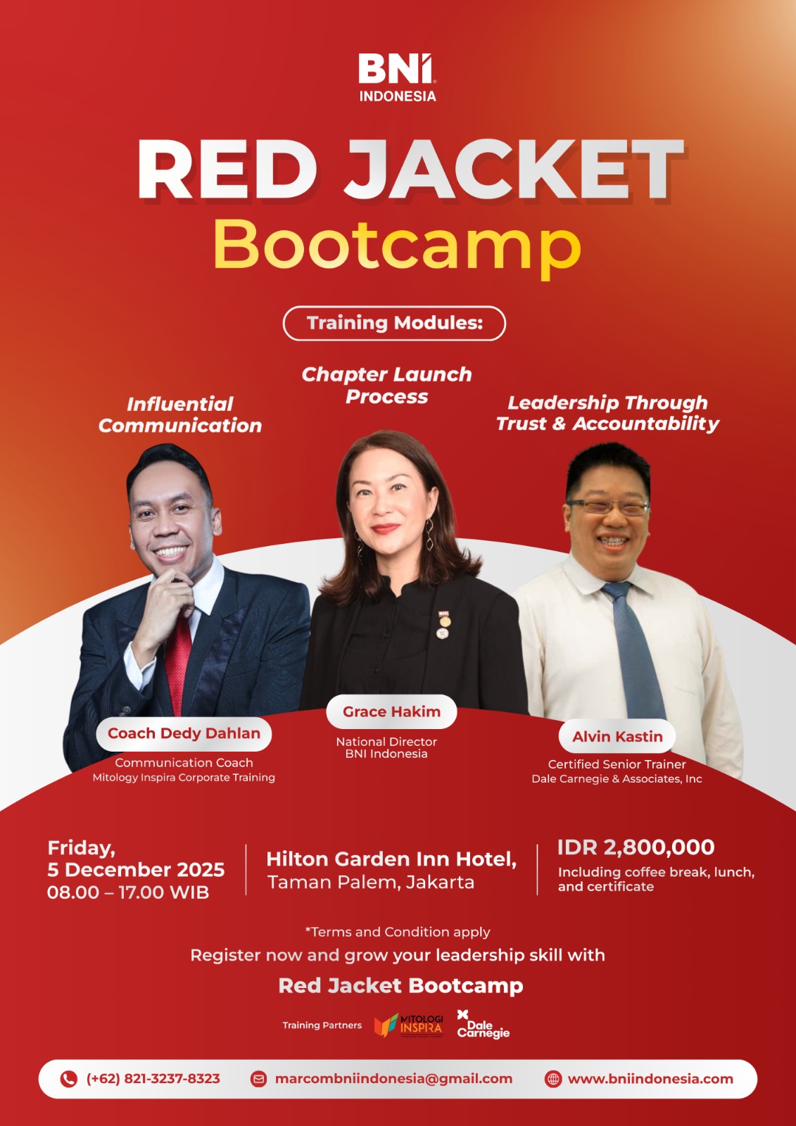 Bangun kepemimpinan dan pengaruh Anda sebagai Launch Director Consultant BNI melalui Red Jacket Bootcamp — program intensif satu hari yang dirancang untuk mengasah keterampilan komunikasi, kepemimpinan, dan kolaborasi di tingkat chapter maupun regional.
