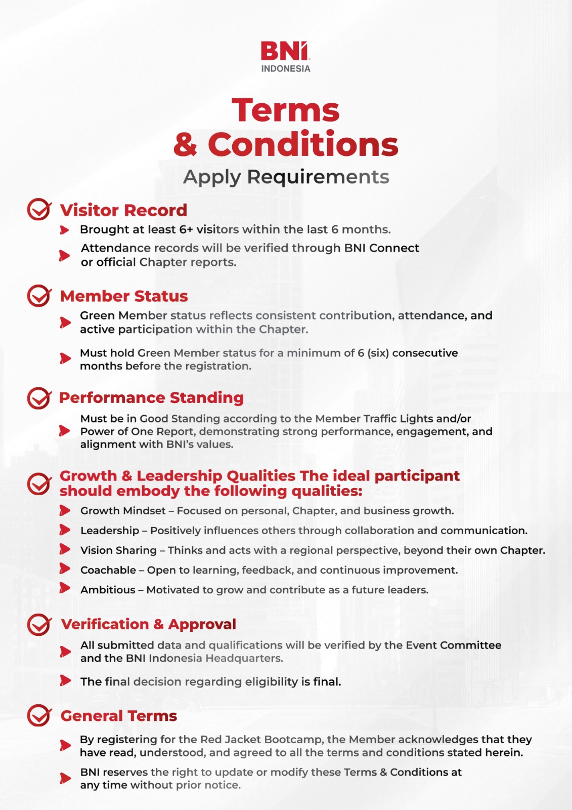 Pelatihan ini hanya terbuka bagi member BNI yang telah memenuhi kriteria tertentu, termasuk Visitor Record, Member Status, dan Leadership Standing sesuai panduan resmi BNI Indonesia.